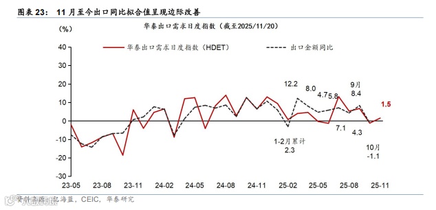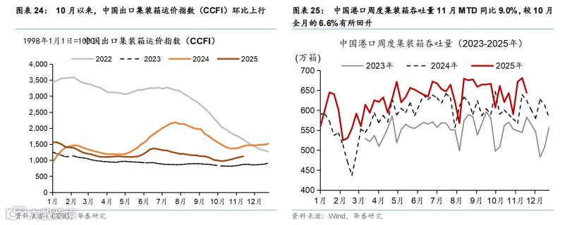 出口高频指标层面,港口高频指标及运价均显示11月至今出口或呈现边际改善。11月1-20日出口需求日度指数HDET显示同比录得1.5%,高基数下较10月的-1.1%呈现修复(图表23)。11月1-16日,中国港口周度集装箱吞吐量同比增长9.0%,较10月的6.6%亦小幅上行。中国出口集装箱运价综合指数(CCFI)与东南亚集装箱运价指数(SEAFI)11月以来连续三周持续环比上涨(图表24-25),此外,韩国11月前20日出口同比较10月全月的3.6%回升至8.2%,经工作日差异调整后,韩国11月前20日出口额同比增速亦由10月全月的14%小幅回落至8.2%,半导体/乘用车/船舶出口比增长26.5%/22.9%/2.3%,对出口的拉动作用明显。