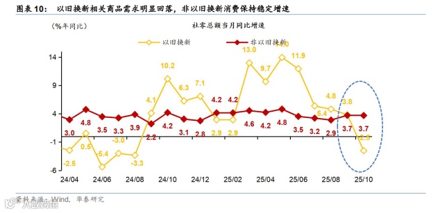 部分宏观经济数据的走弱或受到基数抬升等技术性因素影响,对内需托举效果最明显的财政政策力度也由于去年(9.26后)后置、今年相对前置,呈现出同比增长“前高后低”的形态,但实际力度并未比2-3季度明显下滑;由此,总体内需的“体感”也比同比数据显示的更稳定。包括投资、工业、出口及财政增速在9月以后均走弱,社零同比读数亦受国补退坡影响和去年国庆假期消费情绪回暖下的高基数拖累。一方面,去年财政发力相对后置,广义(一般公共预算+政府性基金)财政支出从去年1-3季度的-0.8%跳升至10月的+20.4%,对应今年10月广义财政支出同比增长较前3季度的7.9%快速回落至-19.1%。另一方面,去年同期“抢出口”效应持续提振出口和工业生产增长抬升生产和投资端基数、叠加今年10月工作日同比较去年少1天,多重因素共振下10月经济活动数据整体走弱。