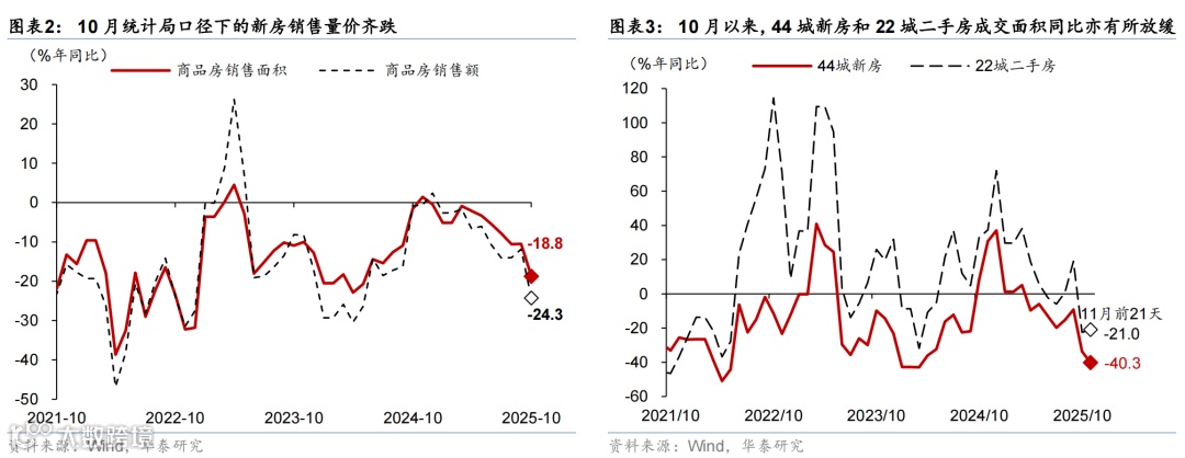 另一方面,地产去杠杆对信用周期和企业现金流的冲击在边际缓解,去杠杆周期进入阶段性“收尾”阶段,今年1-10月虽然新房销售面积累计同比下降5.6%,但22城二手房成交量累计同比增长约10%,显示成交量或有所企稳,而三季度以来的房价下行或有望推动稳地产相关政策预期升温。此外,随着高基数叠加国补退坡的影响显现,服务消费也有望得到更多政策倾斜,对消费增长形成一定托举。