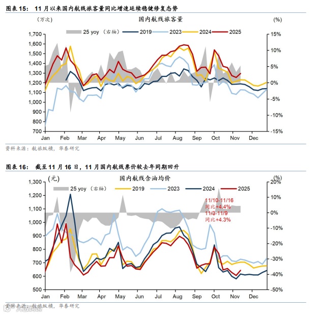 非补贴类的服务型与体验型消费保持相对稳健——11 月虽处淡季,但酒店及商务出行需求亦呈现边际企稳,比如锦江境内酒店 2025第三季度平均房价与出租率增速维持在正区间,RevPAR 降幅收窄,航空需求在传统淡季保持稳定,11月10-16日,国内航线机票均价(含油)同比回升4.4%,旅客量亦同比企稳回升,11月10-16日国内航线旅客量同比增速回升至5.3%(图表13-15),或部分受益于商务出行改善。