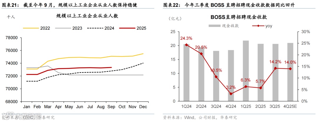总体而言,去除特殊扰动后,地产外的投资和消费走势可能仍然趋于平稳。价格变化作为衡量供需边际变化的最敏感指标,显示环比总需求走势趋于平稳——10月PPI环比年内首次回升至0以上,“反内卷”政策推动以来部分行业供需结构改善,动力煤价格自7月以来持续上行,多晶硅价格亦维持在较高水平,螺纹钢及水泥价格环比降幅趋缓,化工品价格或仍在筑底(图表17-18);同时,3季度的工业企业收入、利润、就业等指标亦边际企稳——截至今年9月数据,规模以上工业企业库存同比增速边际抬升,低基数下亦推升企业营收及利润增速明显上行,此外,规模以上工业企业就业人数保持平稳,BOSS直聘招聘现金收款同比增速在三季度改善、预计四季度保持稳健(图表21-22)。运价、港口吞吐量等高频指标亦显示11月出口增速或边际回升。