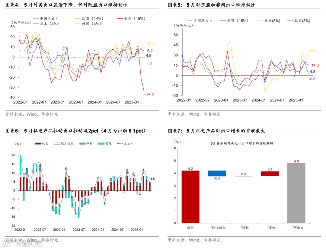 对美出口回落、东盟及欧盟出口维持高增:5月对美出口同比从4月的-21%进一步回落至-34.5%,对5月出口增速的拖累从4月的3.2个百分点走阔至5个百分点;对拉美出口增速亦从4月的17.3%明显回落至2.3%,而对东盟/欧盟/非洲出口同比保持两位数增长,对5月出口增速的提振分别约为1.8/2.5/1.6个百分点。