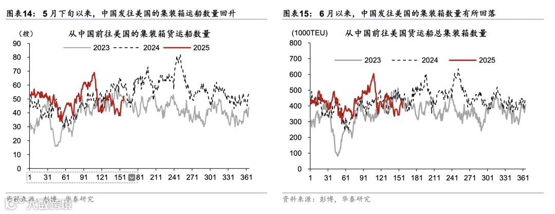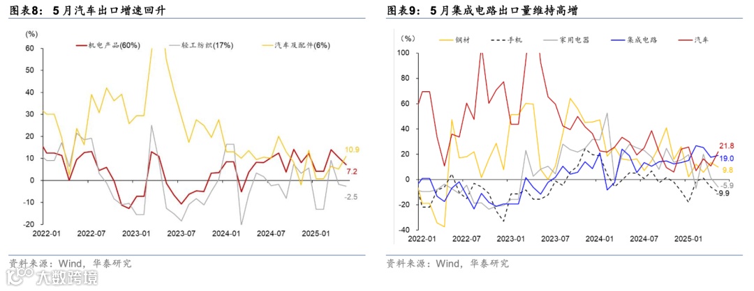 集成电路出口增速继续上行,汽车及配件出口亦维持较强韧性,但劳动密集型产业(箱包、家具等)出口增速仍偏弱,可能显示本轮关税降级后的“抢出口”反弹较为有限。机电产品5月同比增速较4月的10.5%继续放缓至7.2%,而劳动密集型产品中服装同比增速较4月的-0.5%略反弹至2.5%,鞋靴、箱包等出口降幅仍有走阔。