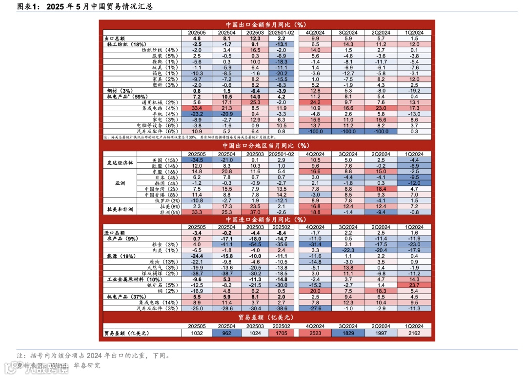 对拉美和非洲出口整体维持强劲增长,占出口的比重进一步上行。受基数走高影响,5月对拉美出口同比从17.3%回落至2.3%;对非洲出口同比则从25.3%进一步上行至33.3%。5月拉美和非洲占整体出口的比重合计达14.4%,占比较2024年进一步上行1.7个百分点。