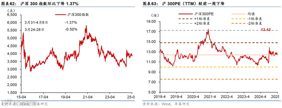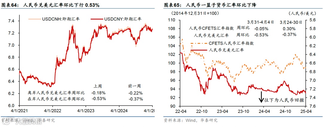 上游:上周国际油价大幅下跌,金价高位回撤。布伦特原油价格环比下降10.9%至65.6美元/桶,或由于全球地缘政治因素以及美国加征关税落地下,市场预期贸易萎靡带动原油需求下降。COMEX黄金亦下降2%至3,056美元/盎司。