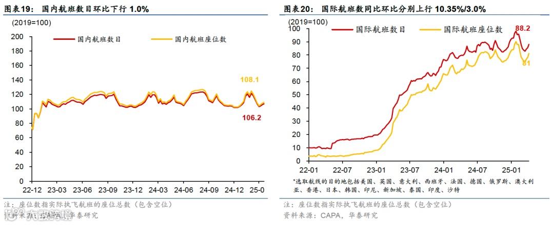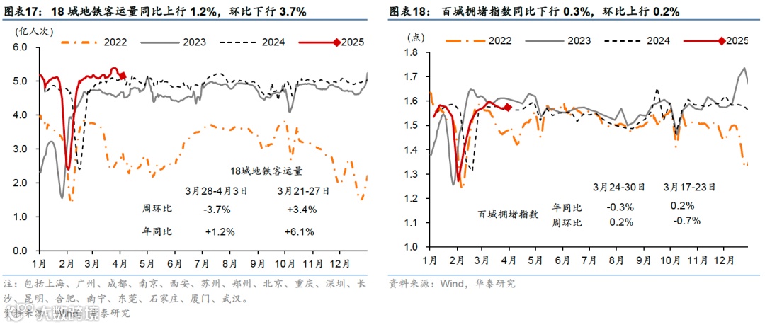 出行活动:地铁客运量同比上升明显但百城拥堵指数同比略有下行。国内旅游市场及商务出行需求阶段性调整导致国内航班数量同比下行,而国际航班数量同比上行。3月28-4月3日,18城地铁客运量周同比上行1.2%,环比下行3.7%。此外,3月24-30日,百城拥堵指数周同比下行0.3%,环比上行0.2%。城际/国际出行方面,国内航班数量环比下行1.0%,国际航班数量环比上行3.0%,分别为2019年同期的106.2%/88.2%。