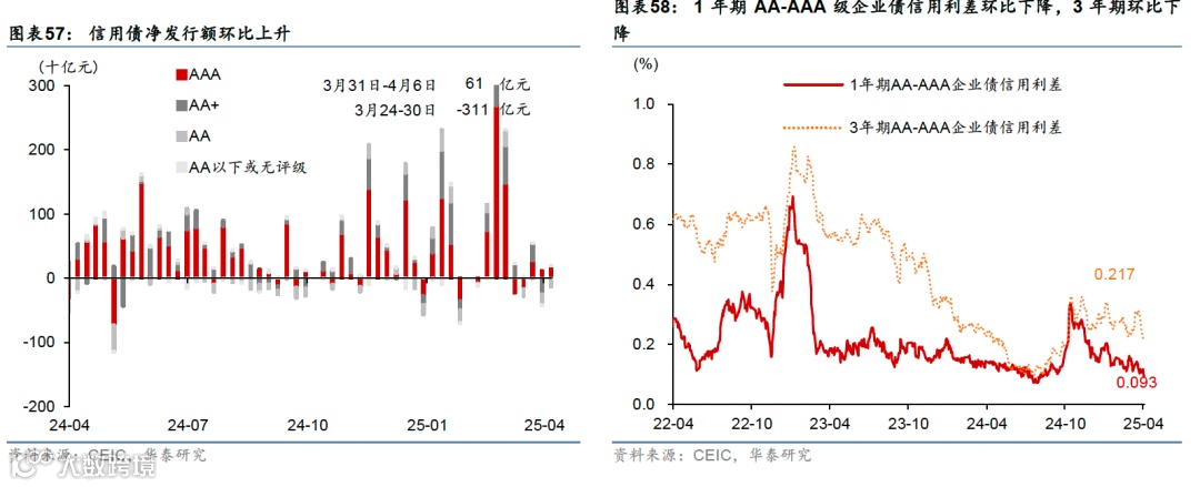融资及汇率:AAA级和AA级企业债收益率均下行,1年期和3年期AA-AAA级企业债信用利差环比均下降。上周房地产债发行55.20亿元,股权融资额环比上升。上周沪深300指数环比下降1.37%,PE(TTM)估值水平较前一周边际回落。汇率方面,上周人民币兑美元汇率较前一周下行0.53%,对一篮子货币汇率环比下行0.05%。上周利率债净发行同比多增2769亿元,其中,国债/地方政府债/政策性银行债净发行同比多增696/1683/390亿元。