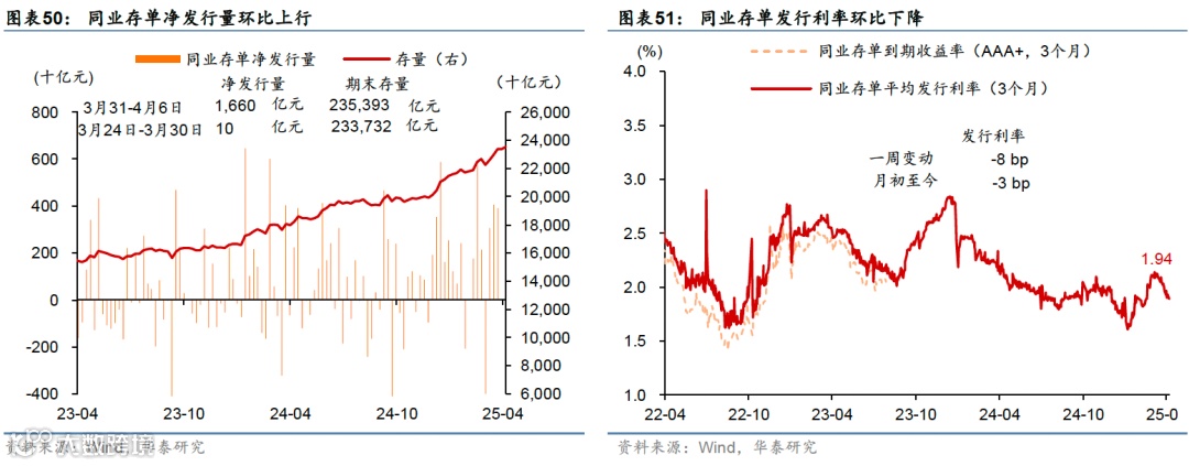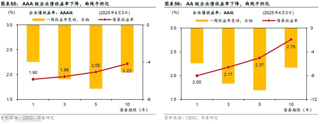 流动性指标:银行间流动性宽松,同业存单发行利率环比下行。银行间利率整体下行,DR007/R007环比下行40/55个基点。1年期国债收益率环比下行4个基点,10年期国债收益率环比下行9个基点,国债收益率曲线整体趋平。上周央行质押式回购加权利率上行55.0个基点;同业存单净发行量环比回升,发行利率环比下降。