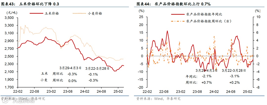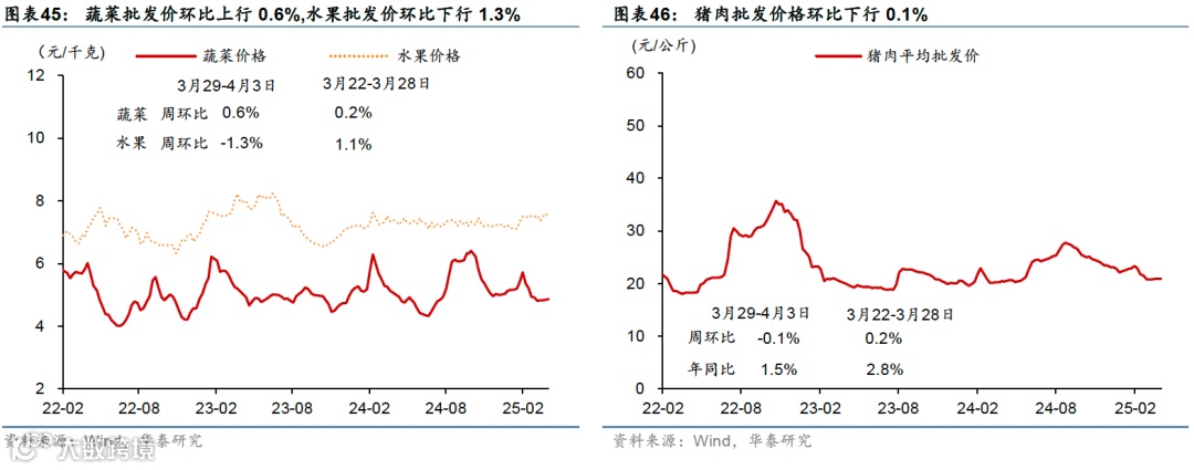 国际油价大幅下跌、金价止涨回跌,国内原材料价格分化。上周布伦特油价环比下降10.9%至65.6美元/桶;COMEX金价下降2%至3,056美元/盎司;国内铜/螺纹钢价格环比下行2.9%/1.3%,尿素/水泥环比分别上行1.6%/0.4%。农产品价格指数环比上行0.7%,其中蔬菜价格环比上涨0.6%,水果/猪肉价格环比下行1.3%/0.1%。