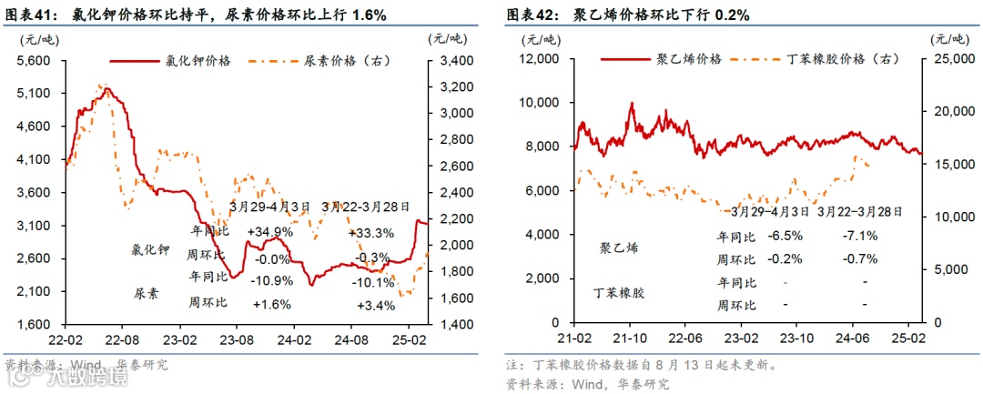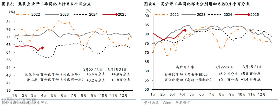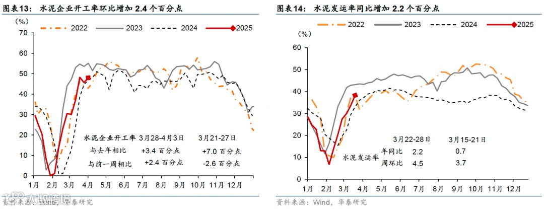 下游:国内建筑业需求提升,水泥开工率同比上升但建筑钢材成交量同比回落。3月28-4月3日,水泥企业开工率环比上行2.4个百分点,高于去年同期3.4个百分点。3月29-4月4日,建筑钢材日均成交量同比回落32.7%,环比回升3.1%。此外,3月28-4月3日,半钢胎开工率环比下降1.2个百分点,同比上行1.3个百分点。