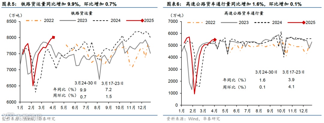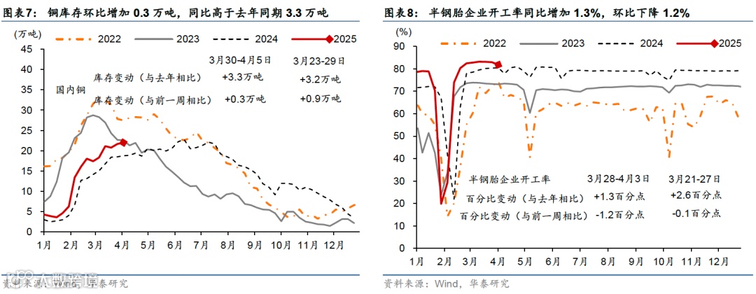 中游:国内铜仍在累库过程,铁路货运量和高速公路货运量同比明显走强。3月30-4月5日,铜库存同比增加3.3万吨,环比较上一周增加0.3万吨。3月24-30日,铁路货运量高于去年同期9.9%,高速公路货车通行量环比上行0.1%,高于去年同期1.6%,可能反映关税政策不确定性预期下抢出口效应仍对工业生产和货物运输形成支撑。