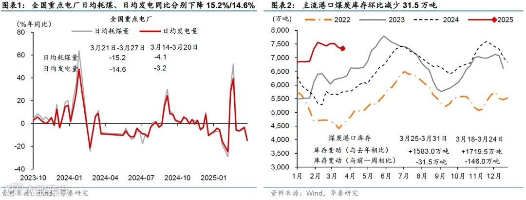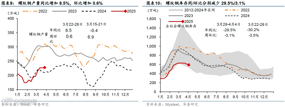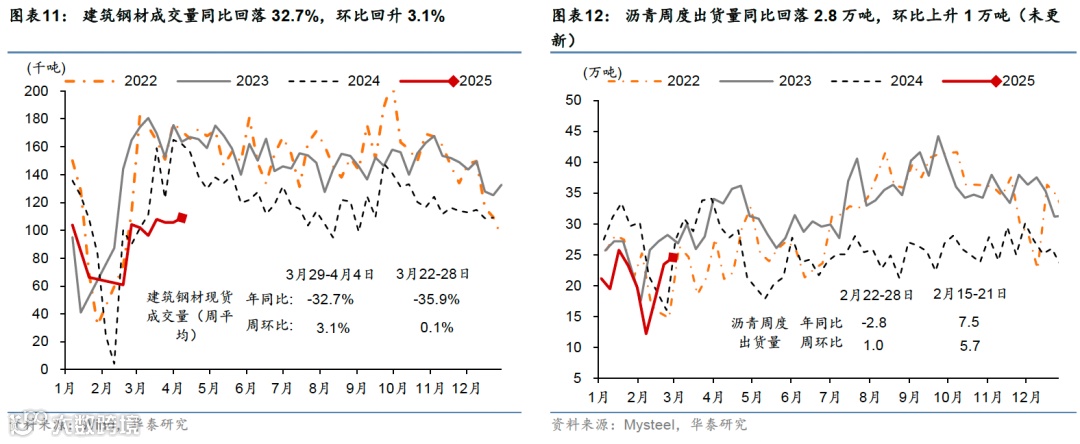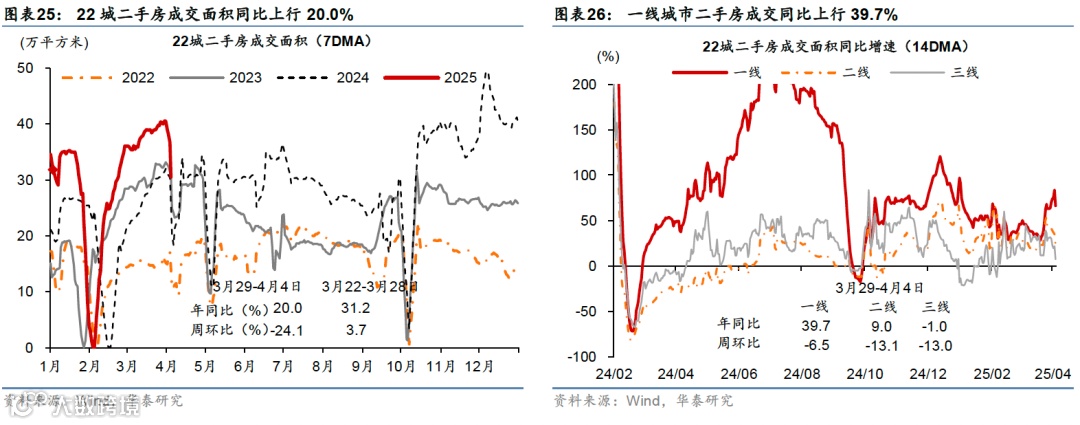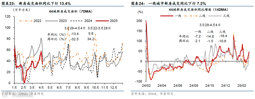 上周工业生产持续回暖,地产成交同比有所回落、但一线城市二手房需求仍在高位,港口高频数据显示3月出口或保持韧性,但集装箱运价持续回落或显示后续出口需求承压。出行方面,上周18城地铁客运量同比上行1.2%,清明假期首日全国交通出行人数近2.9亿人次,同比增长9.7%,3月24-31日,乘用车日均销量同比下行4.2%。工业生产方面,上周焦化/高炉/水泥企业开工率同比回升5.6/5.2/3.4个百分点,而建筑钢材成交量同比回落32.7%,或显示投资需求延续分化态势。出口方面,HDET高频指显示3月出口同比增速或录得4%左右,但关税可能对后续出口增长带来较大压力。地产方面,上周44城新房/22城二手房成交面积同比从前一周的5.6%/31.2%回落至-13.4%/20.0%、其中一线二手房成交同比录得39.7%。