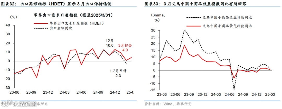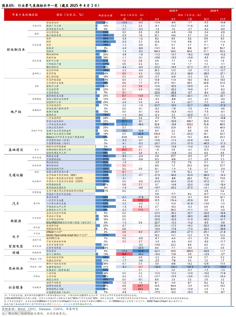 外贸需求:近期国际航线运价整体下滑,港口高频指标显示3月出口或保持稳健,但关税影响可能逐步显现。截至4月4日,BDI指数周环比持续回落、较前一周环比下行7.1%。高频指标华泰出口需求日度指数(HDET)显示3月1-31日出口需求日度指数HEDT显示同比录得4%左右,可能体现“抢出口”效应有所退坡。