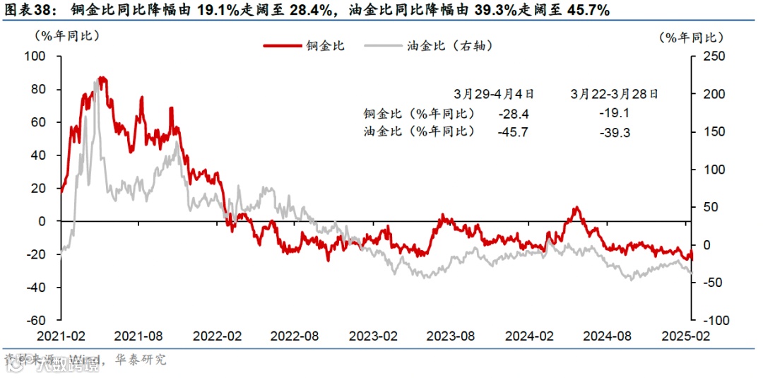 中游:国内原材料价格走势分化但整体有所回落。上周国内铜/螺纹钢价格环比下行2.9%/1.3%;中游化工品方面,尿素/水泥环比分别上行1.6%/0.4%,聚乙烯价格环比下行0.2%;动力煤环比持平,焦煤环比上行0.5%。铜金比同比降幅由19.1%走阔至28.4%,油金比同比降幅由39.3%走阔至45.7%。