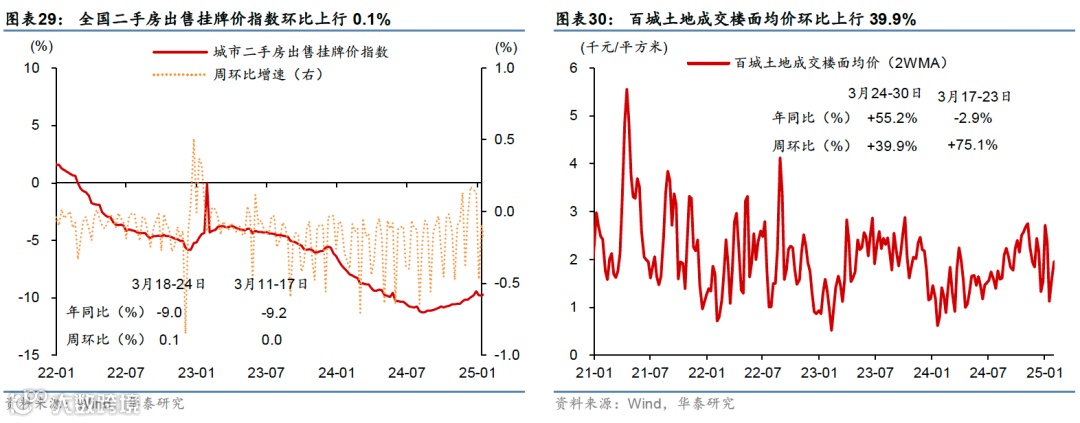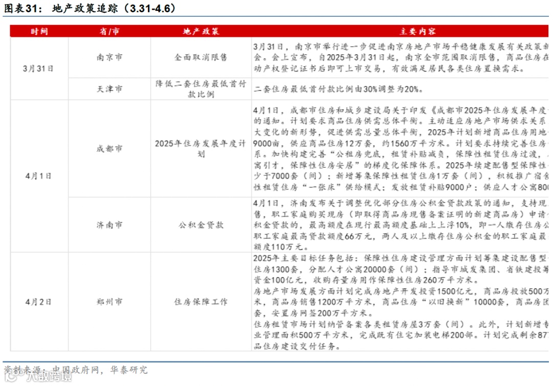 地产政策方面:1)3月31日,南京市宣布,自2025年3月31日起,南京全市范围取消限售,商品住房在取得不动产权登记证书后即可上市交易,有效满足居民各类住房置换需求。2)3月31日,天津市二套住房最低首付款比例由30%调整为20%。3)4月1日,成都市住房和城乡建设局关于印发《成都市2025年住房发展年度计划》的通知。2025年计划新增商品住房用地供应9000亩,供应商品住房12万套,约1560万平方米。2025年续建配售型保障性住房不少于7000套(间);新增筹集保障性租赁住房1万套(间),积极推广宿舍型保障性租赁住房“一张床”供给模式;发放租赁补贴9000户;供应人才公寓8000套。4)4月1日,济南市发布关于调整优化部分住房公积金贷款政策的通知,支持现房销售,职工家庭购买现房(即取得商品房现售备案证明的新建商品房)申请住房公积金贷款的,最高额度在现行最高额度基础上上浮10%,即一人缴存住房公积金的职工家庭最高贷款额度66万元,两人及以上缴存住房公积金的职工家庭最高贷款额度110万元。5)4月2日,郑州市住房保障工作发布要点。2025年主要目标任务包括:保障性住房建设管理方面计划筹集建设配售型保障性住房1300套,分配人才公寓20000套(间);指导市城发集团、省铁建投筹措收购资金100亿元,收购存量房用作保障性住房260万平方米。