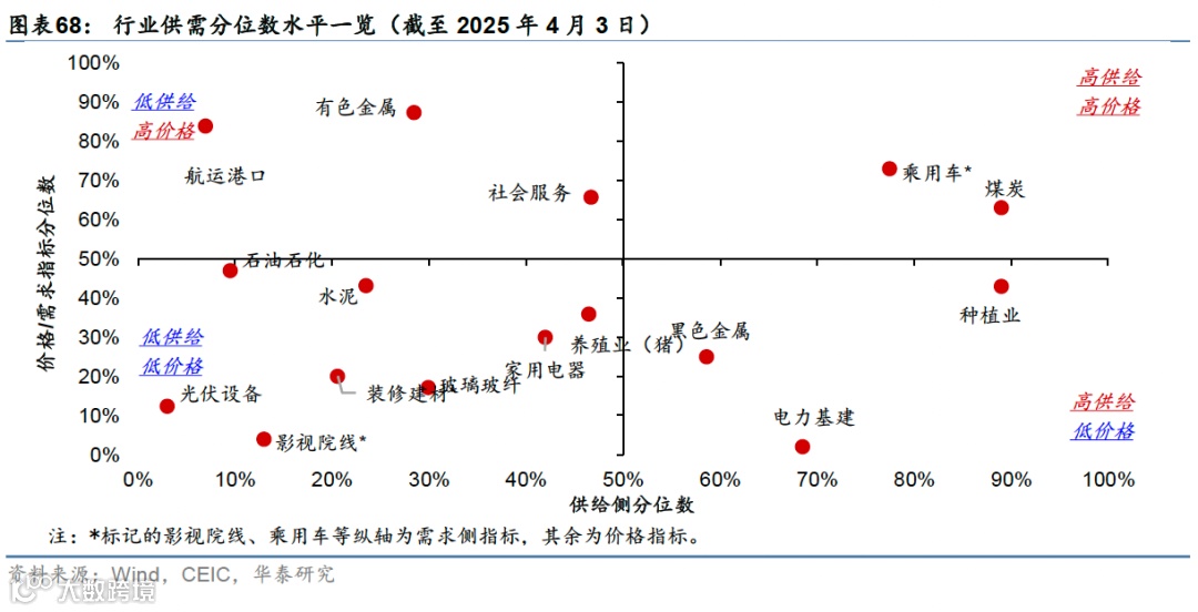 光伏设备、装修建材、玻璃玻纤、黑色金属、电力基建和水泥等行业所在分位数水平处于低供给、低需求区间,体现上述行业供需两侧均有所承压。通信产品、锂电池和光伏设备的价格水平仍在低位。