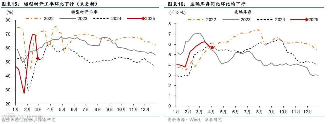 制造业:国际油价周环比大幅回落,有色金属价格环比整体走低。1)石油石化:4月至今布伦特原油价格月均环比回落8.5%,上周环比回落10.9%,主要受“对等关税”政策冲击和OPEC+供应扰动;炼油厂开工率月环比平均上行2.5个百分点。2)煤炭:动力煤价格月均环比持平、港口煤炭库存月均环比上行1.6%。3)有色金属:国际铝、铜等有色金属价格位于90%-98%的高分位水平,其中国际铜/铝价格上周环比分别回落2%/0.8%;库存方面,上周铝库存回落2%,铜库存回落1%至2013年以来52%的分位数水平。4)黑色金属:螺纹钢/线材价格上周回落0.6%/1.1%;库存方面,螺纹钢库存周环比回落4.4%、绝对水平回落至48%左右的分位数水平;5)基础化工品价格涨跌互现,聚乙烯/氯化钾4月至今均价环比回落0.9%/0.4%,而尿素价格4月至今均价环比上行4.3%。
