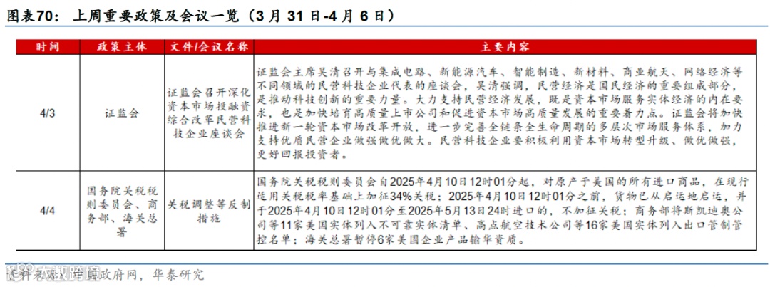 (1)4月3日,证监会召开深化资本市场投融资综合改革民营科技企业座谈会。证监会主席吴清,集成电路、新能源汽车、智能制造、新材料、商业航天、网络经济等不同领域的民营科技企业代表参与。吴清强调,民营经济是国民经济的重要组成部分,是推动科技创新的重要力量。大力支持民营经济发展,既是资本市场服务实体经济的内在要求,也是加快培育高质量上市公司和促进资本市场高质量发展的重要着力点。证监会将加快推进新一轮资本市场改革开放,进一步完善全链条全生命周期的多层次市场服务体系,加力支持优质民营企业做强做优做大。民营科技企业要积极利用资本市场转型升级、做优做强,更好回报投资者。