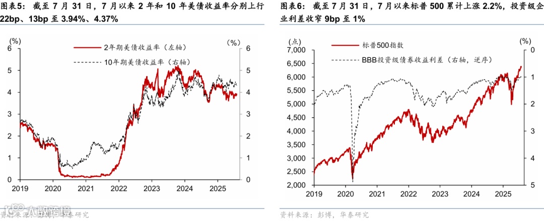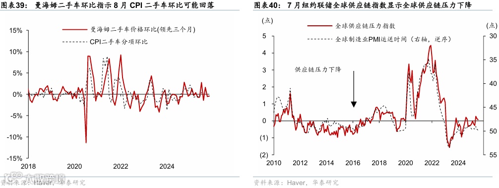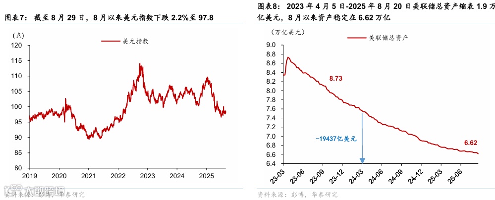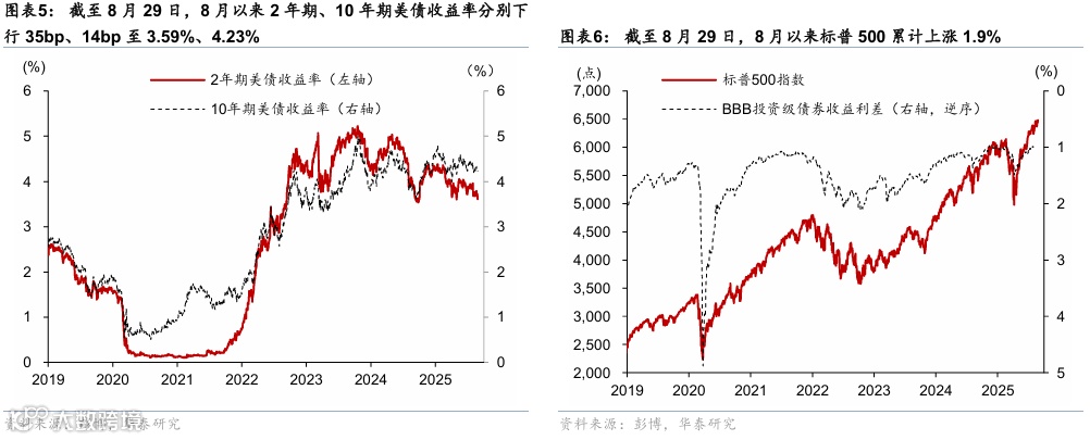 8月美股上涨、美元指数与美债收益率下行推动金融条件放松。8月1日至29日,高盛金融条件指数累计放松14bp,汇率、长端利率、股市、短端利率、信用利差分别贡献-8bp、-6bp、-6bp、0bp和6bp。具体看,截至8月29日,8月以来标普500累计上涨1.9%,2年期、10年期美债收益率分别下行35bp、14bp至3.59%、4.23%,美元指数下跌2.2%至97.8。