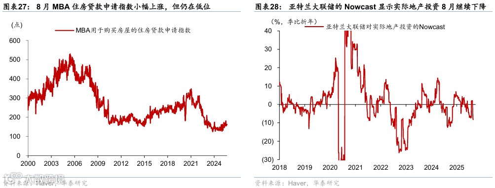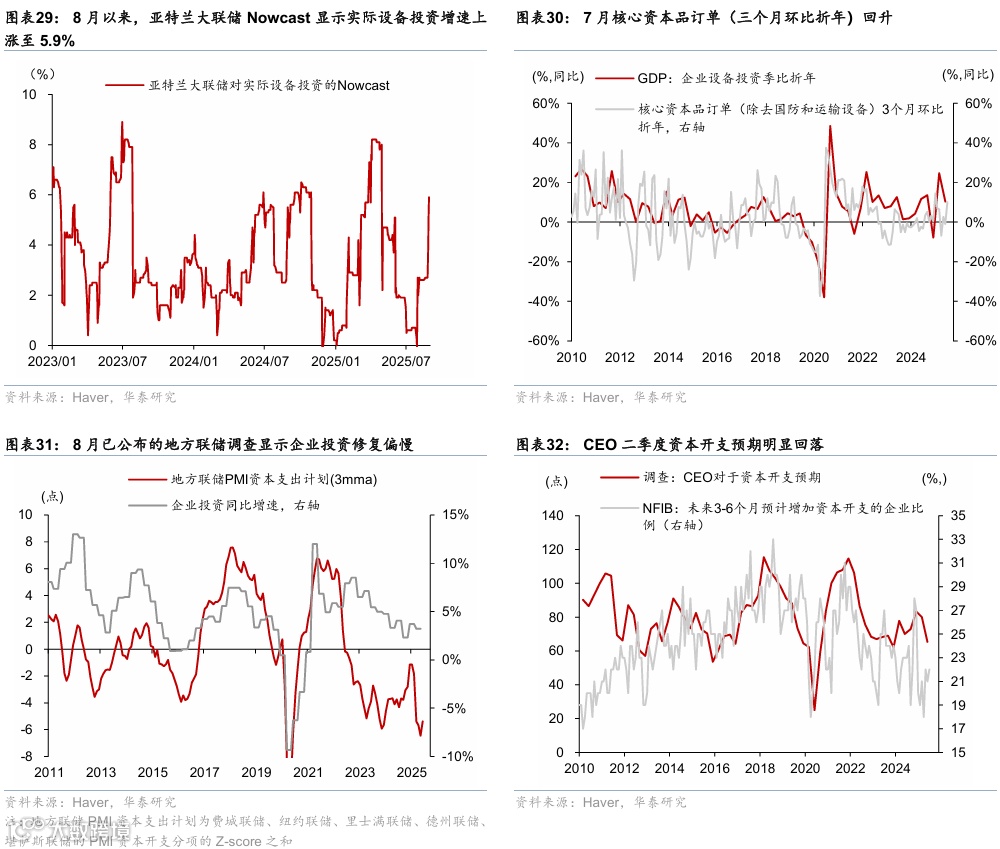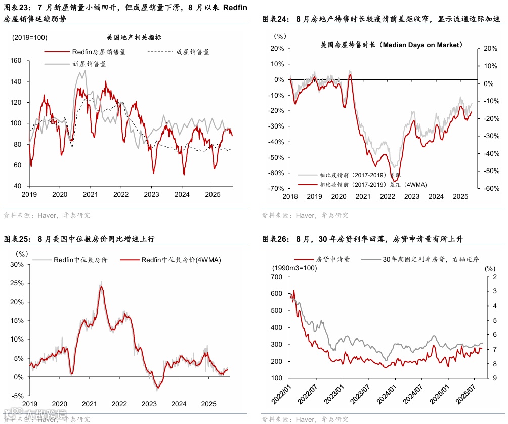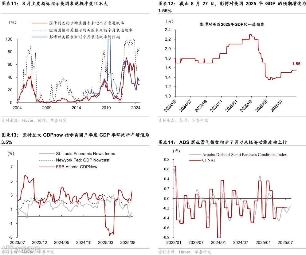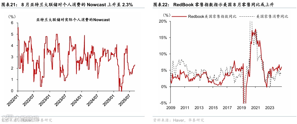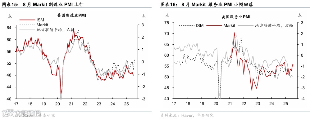 美国二季度GDP受投资分项推动上修。增长方面,美国二季度GDP季环比折年增速由3.0%上修至3.3%,高于预期(彭博一致预期,下同)的3.1%。其中最终国内购买增速由1.2%上修至1.9%,与一季度持平,主要是受到无形资产投资-软件增速显著上修推动,背后或反映AI在美国企业中应用加速;居民消费增速也上修0.2pp至1.6%。8月美国Markit综合PMI超预期升至55.4,主要受制造业PMI大幅回升推动(上行3.5至53.3),而服务业PMI虽小幅回落0.3至55.4,但仍高于预期。消费方面,7月实际个人消费支出环比增速0.3%,高于前值的0.1%,符合预期。其中耐用品消费回暖,服务消费整体偏弱。Redbook零售指数指示8月零售同比增速边际上行。投资方面,亚特兰大联储Nowcast显示三季度非住宅投资增速升至5.9%,但8月已公布的地方联储调查显示企业资本开支意愿修复偏弱。地产方面,7月新屋销量小幅回升,但成屋销量下滑,8月以来Redfin房屋销售延续弱势。