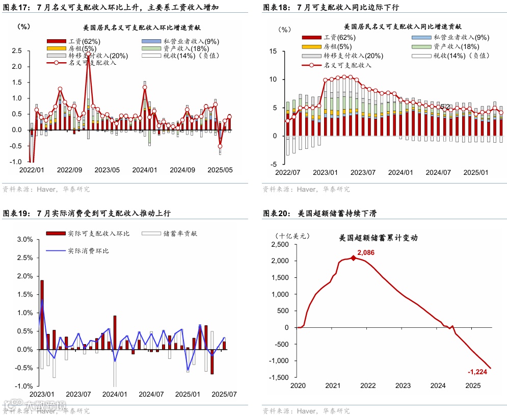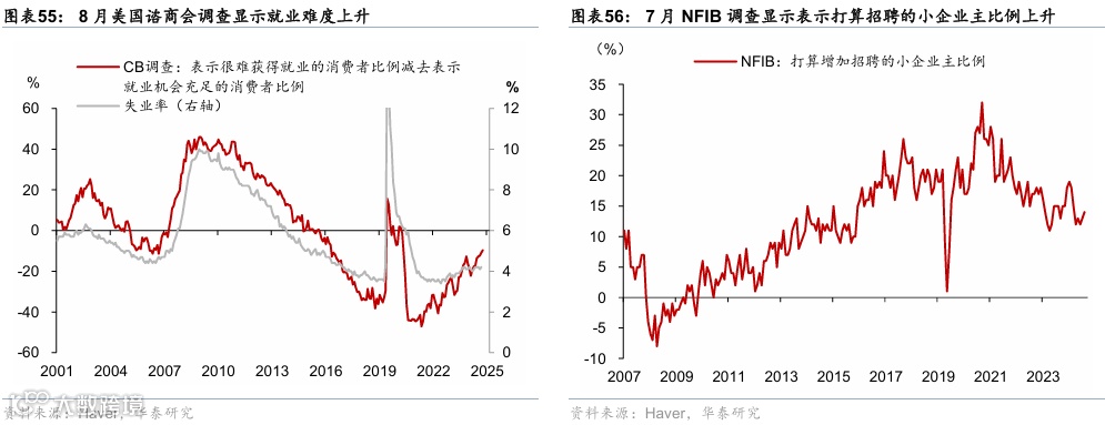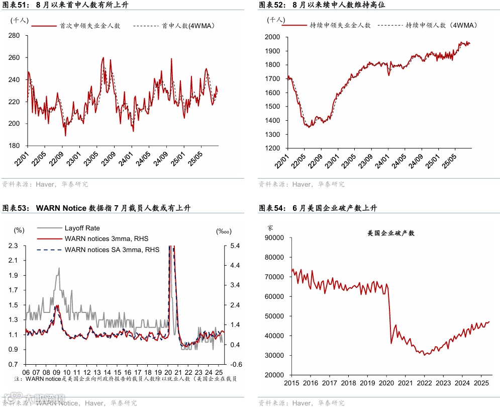 7月新增非农低于预期,5-6月就业出现明显下修,就业市场放缓程度超预期。7月美国新增非农就业7.3万人,低于预期的10.4万人,且5-6月累计大幅下修25.8万至1.9万人、1.4万人,失业率虽如期小幅上行0.1pp至4.2%,但主要是劳动参与率超预期回落所致。驱逐非法移民的冲击以及关税的滞后影响之下,美国就业市场处于供需共同回落的弱平衡中。前瞻指标NFIB企业招聘意愿显示三季度新增非农仍整体偏弱,四季度或有企稳,但回升幅度或受供给回落限制。高频指标Indeed显示企业招聘小幅回升、WARN指示企业仍未大幅裁员;8月以来周度首申、续申整体走高,但最近一周均有小幅下行。