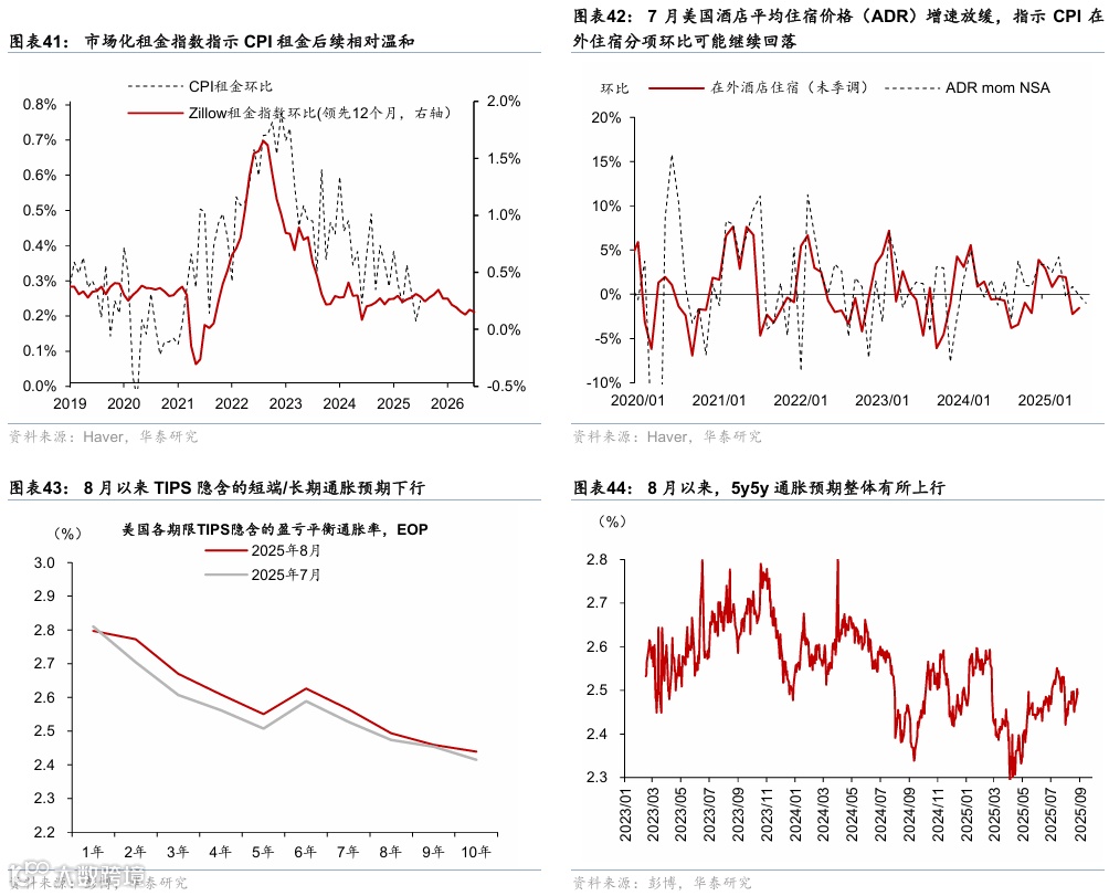 美国7月PCE通胀整体符合预期,缓解对关税推高通胀的担忧。7月美国核心PCE通胀环比持平于0.3%,核心PCE同比小幅上行0.1pp至2.9%,均符合预期。分项来看,核心商品环比增速由6月的0.39%回落至0%,受关税影响较大的家具、娱乐商品均有所降温,新车二手车边际回升。微观层面,美国超市商品价格7月整体上行,8月边际降温。从通胀预期来看,8月以来,TIPS长短端通胀预期均有所升温,2y、10y 美债盈亏平衡收益率分别上行约20bp、8bp至2.74%、2.42%,5y5y通胀预期上行7bp至2.48%。