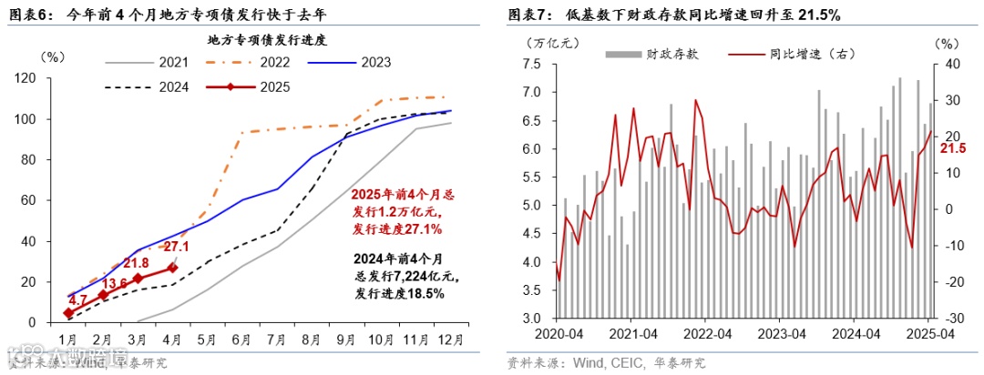 1)4月基建投资增速较3月的12.6%回落至9.6%,较一季度基建投资11.5%的较高增长有所放缓,或显示4月财政扩张较3月边际减速。我们计算基建投资的口径包括电力、热力、燃气及水生产和供应业。今年广义财政发力偏前置,但财政资金拨付仍待提速:2025年前4个月地方专项债累计发行1.2万亿元,同比多增4,680亿元,发行进度占全年计划比例为27.6%、亦快于去年同期进度的18.5%;而4月财政存款余额环比增加3,710亿元,同比多增2,729亿元(图表6-7)。