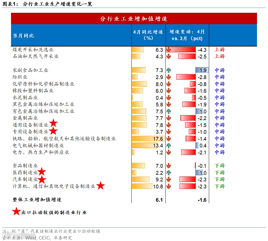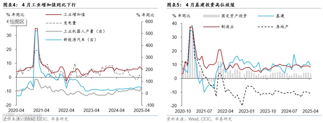 4月规模以上企业工业增加值同比较3月的7.7%小幅回落至6.1%,高于彭博一致预期的5.7%,关税冲击下,4月较一季度工业增加值同比6.5%略有放缓,分行业而言,铁路船舶、电气机械、计算机通信行业仍维持两位数增长。铁路船舶制造同比增速从3月的19%略回落至17.6%,电气机械行业则较3月的13%进一步回升至13.4%,计算机电子行业则从3月的13.1%放缓至10.8%,我们估算其对工业增加值同比增速的贡献约为1.2个百分点;汽车制造同比从3月的11.5%回落至9.2%,对工业增加值同比增速的拉动仍略放缓至0.7个百分点。此外,纺织业同比增速下行2.9个百分点至2.9%,可能显示受4月关税的冲击较大(图表1)。