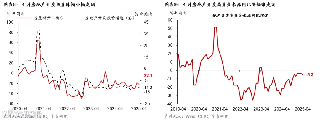 3)4月地产成交额及房地产开发投资同比降幅亦较一季度有所走阔——4月房地产开发投资同比降幅从3月单月/一季度的10%/9.9%走阔至11.3%。需求端,4月商品房成交金额同比降幅从3月的1.6%走阔至6.7%,商品房销售面积同比降幅亦较3月的0.9%走阔至2.1%,销售端“以量换价”趋势仍在延续,且与社融分项中4月新增居民中长期贷款转负至-1,231亿元形成印证,显示美国加征关税下居民收入预期与地产需求有所走弱。资金来源方面,4月房地产到位资金同比降幅较3月的3.9%略走阔至5.3%,其中抵押贷款和定金及预收款同比增速较3月的-1.4%/0.3%回落至-8.5%/-12.6%,显示房企现金流状况仍承压;而国内贷款同比增速从3月的6.2%回升至14.9%。此外,地产新开工面积同比降幅从3月的18.1%再度走阔至22.1%(图表8-9)。