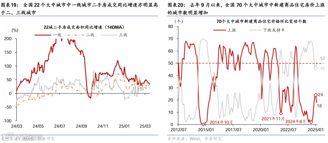 不同城市之间的地产成交呈现明显分化,其中一线及部分强二线城市地产成交的回升动能及可持续性明显强于其他城市。虽然近期全国层面的新房成交面积同比回落,但一线城市新房成交持续同比多增。年初至3月14日,全国44大中城市新房成交面积同比上升2.2%,主要是由一线城市同比上升21.1%拉动,而二、三线城市分别同比下降3%、1.3%(图表17和18)。同期二手房成交的表现类似,全国22个大中城市二手房成交同比上升34.3%,其中一、二、三线城市分别同比上行47.2%、28.5%、17.7%(图表19)。