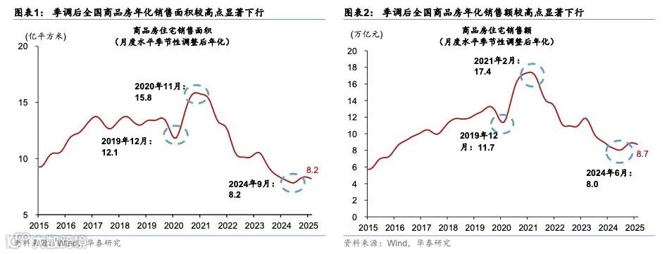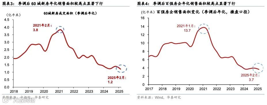 中国地产(一手+二手)总成交额去年4季度开始回升,今年少量城市出现了价格下行放缓的信号。回顾过去4年,中国地产市场快速完成了一定体量的调整,且经历了供给侧较快的出清过程。统计局数据显示,中国新房成交量年化水平从2021年中的高点逐步回落,而百强房企和60城商品房口径的累计降幅已接近其他国家地产调整区间上限。我们去年5月开始从长周期的角度探讨本轮地产下行周期的潜在“底部”区间的成交量水平及时点,彼时的答案是若名义增长企稳,本轮地产调整的“底部”换房率可能在4%附近。按彼时趋势,预计在2025年中前触及这一水平(参见《本轮地产周期何时会初现曙光?》,2024/5/31)。去年4季度以来地产市场的积极信号在增加(参见《近期中国地产行业的一些积极变化》,2025/2/2),本文更新房产及土地市场数据走势,并探讨地产相关需求和预期变化的深远宏观影响。