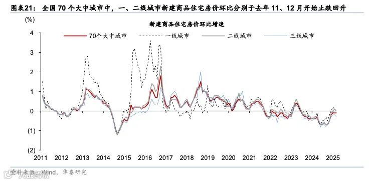 随着地产成交量回升,全国房价环比上升的城市数量增加,其中一、二线城市房价环比已领先三线城市转正。随着地产成交量改善,去年9月以来,统计局公布的全国70个大中城市中新建商品住宅房价上涨的城市数明显增加,上涨城市数已从去年8月最少的2个城市增至今年2月的18个城市(图表20)。更值得关注的是,全国70个大中城市中,一、二线城市新建商品住宅房价环比分别于去年11、12月开始止跌回升,而三线城市房价环比降幅亦有所收窄(图表21)