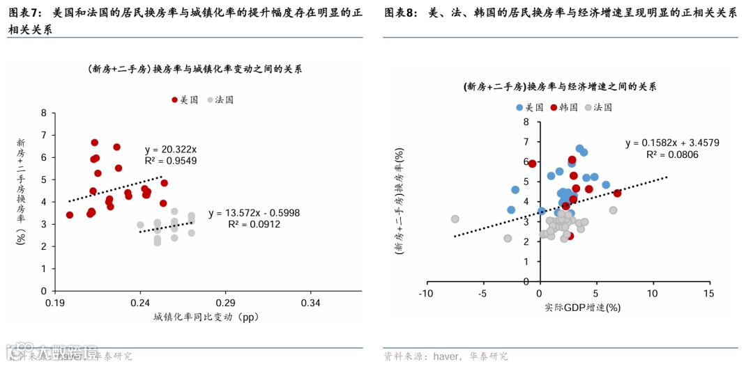 居民换房率不失为估算国内地产成交底部区域的一种方法。如我们在《本轮地产周期何时会初现曙光?》(2024/5/31)中分析,居民换房率为(新房+二手房)年度成交量占房屋存量的比例,代表房屋周转率,如4%的换房率意味着居民平均每25年换一次房。海外主要经济体数据显示,城镇化提升越快、经济增长越快的国家,居民换房率通常越高,因此居民换房率可能更适用城镇化率与经济增长趋稳的发达经济体,如美国、韩国居民换房率稳定在4-6%的区间,而法国地产交易成本较高、但也稳定在3%左右(图表7-8)。相比之下,较高的经济增速、城镇化率提升、户籍人口加速落户、人口向大城市集聚、以及家庭规模小型化等因素可能都意味着中国居民换房率应高于发达经济体。但考虑地产周期调整有比较强的惯性,居民换房率不失为估算国内地产成交底部区间的一种方法。