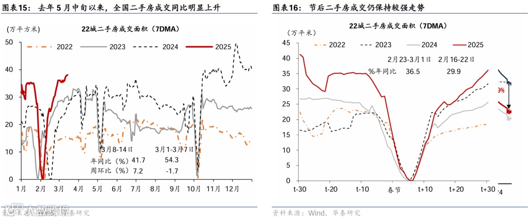 与新房成交有所回落不同,去年5月中旬以来,二手房成交持续较强。随着地产相关政策持续放松,居民购房负担能力明显改善。无论是从直接衡量居民购房能力的房价收入比、还是居民还贷现金流的指标来看,居民的可负担能力或已接近2017年的水平(图表12和13)。另一方面,地产成交量持续下行推动房价有所调整,而价格机制更为市场化的二手房价格调整幅度更大,且二手房不受交付不确定性的困扰(图表14)。由此,去年5月中旬以来,全国二手房成交同比明显上升,尤其是春节后仍保持较强走势(图表15和16)。