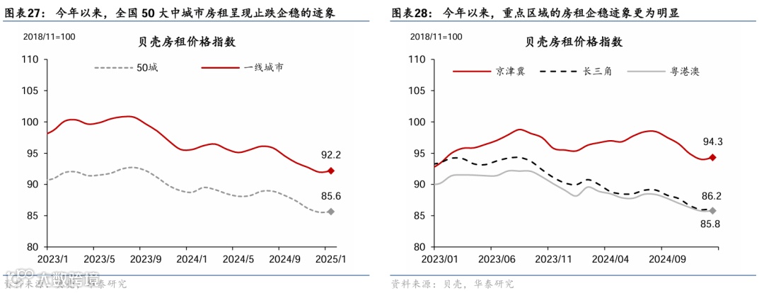 今年以来,一线城市及重点区域的租赁需求有所回升,预计租金降幅有望收窄。贝壳房租数据显示今年1月50城房租呈现边际企稳的趋势,其中一线城市及京津冀等重点区域的房租回升迹象更为明显(图表27和28)。在房地产发展新模式下,长租公寓、保障性住房等租赁住房供给或将进一步增加,但随着租赁需求回升,预计今年租金降幅有望收窄。