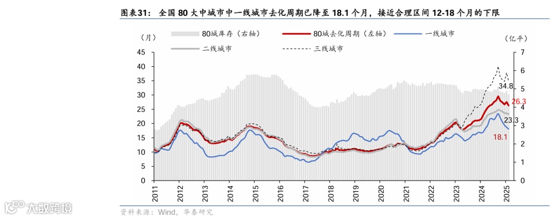 供给减少、叠加需求边际改善,商品房库存去化有所加速。全国80大中城市商品房库存已从去年9月最高的5.1亿平米降至今年2月的4.7亿平米,同期去化周期已从去年9月最高的29.6个月回落至26.3个月,其中一线城市去化周期已降至18.1个月,接近合理区间12-18个月的上限,而少数城市(如深圳8.3个月、杭州7.9个月等)的去化周期已低于合理区间(图表31)。如果假设超过3年的新房库存为很难去化的无效库存,则全国商品房有效库存的降幅可能更为明显。
