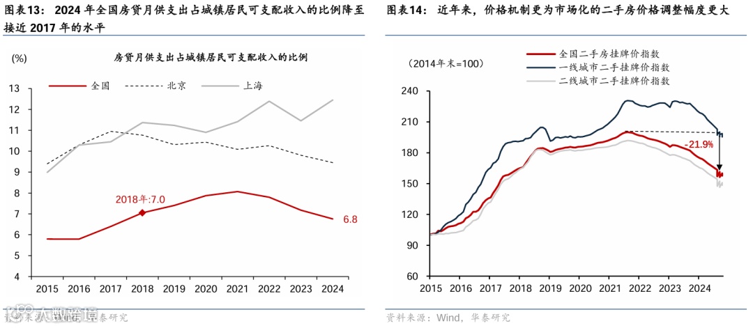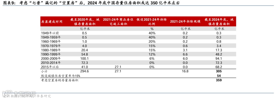 目前中国的换房率已接近当前发展水平所匹配的下限。基于七普公布的城镇存量房数据,再考虑部分“空置房”的漏记问题、以及2021-24年的新建商品房住宅和存量房拆迁面积,我们估算2024年底中国存量住房面积或达310-350亿平米左右(图表9),由此,4%的换房率底部对应全国新房+二手房的年成交面积为12-14亿平米。2024年3季度我国换房率已从2020年7-8%的高位降至年化4%的水平,接近美、韩等国居民换房率4-6%的区间下限(图表10)。