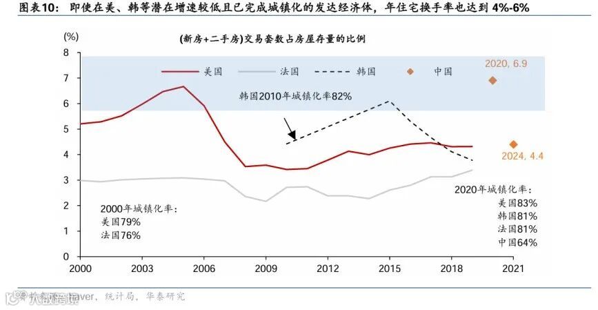 本轮中国地产成交量的累计调整幅度已接近海外国家类似周期的区间上限;且换房率((新房+二手房年度成交)/城镇房屋存量%)从2020年7-8%的高位降至2024年3季度年化4%的水平,已接近城镇化率更高、生活水平升级更慢的发达经济体换房率区间下限(如美国、韩国)。