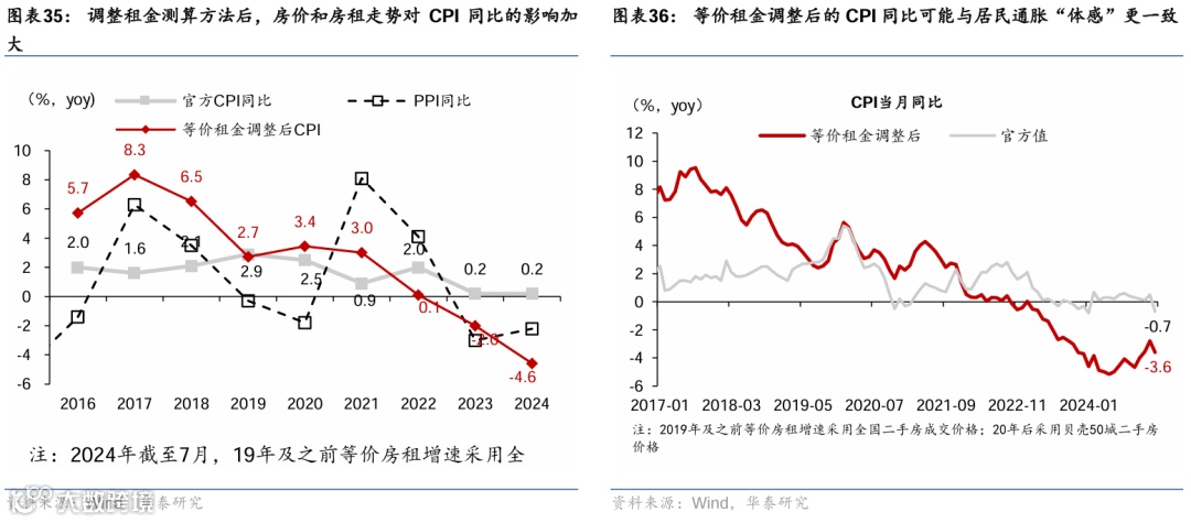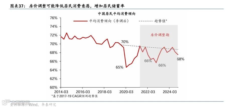 房产和租金价格走势直接影响居民通胀“体感”和通胀预期。由于统计局采用成本法核算居民自有住房服务增加值,可能会导致CPI走势与居民通胀“体感”不一致。如果使用市场租金走势来衡量等价租金变化,调整后CPI同比走势可能低于官报CPI(图表35和36)。“体感”通胀下行会推升真实利率,从而导致储蓄率上升、消费倾向下行(图表37)。由此,如果房价和租金价格的降幅收窄甚至企稳,将有助于改善居民通胀“体感”和通胀预期,从而促进消费倾向回升。