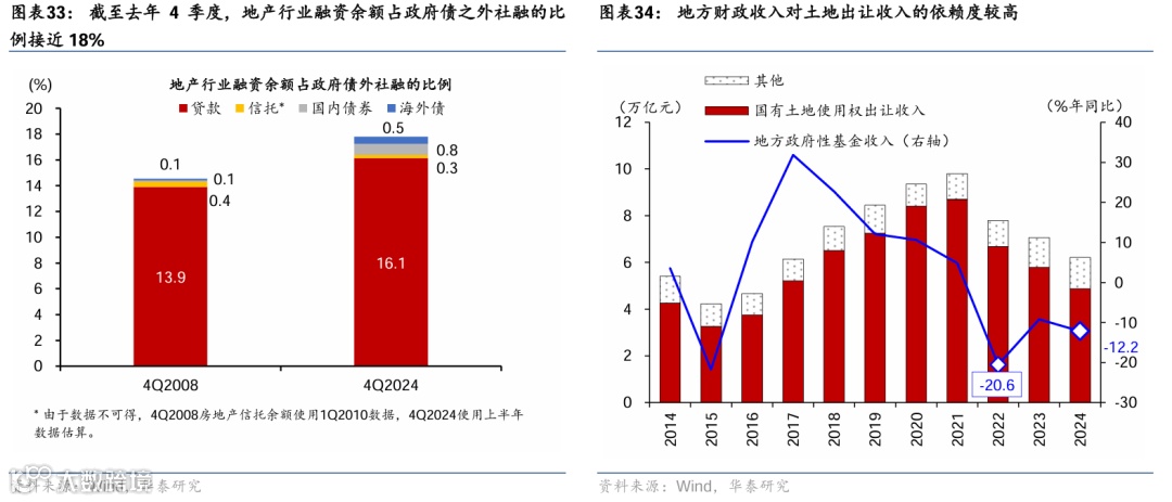 房产和土地市场走势直接影响地方政府的收入走势和支出能力。地产市场企稳对缓解地方政府现金流压力,提高支出能力和财政赤字向财政支出的转化率是决定性因素之一。2024年地方财政收入中土地出让收入占比达到八成(图表34)。过去几年,地产周期偏弱导致地方政府性基金收入承压;由于政府性基金以收定支,进而导致近年来地方政府性基金支出增速明显不及预期。如果地产周期能够企稳,也将有利于改善地方政府收入、缓解其现金流压力,并增加财政支出。