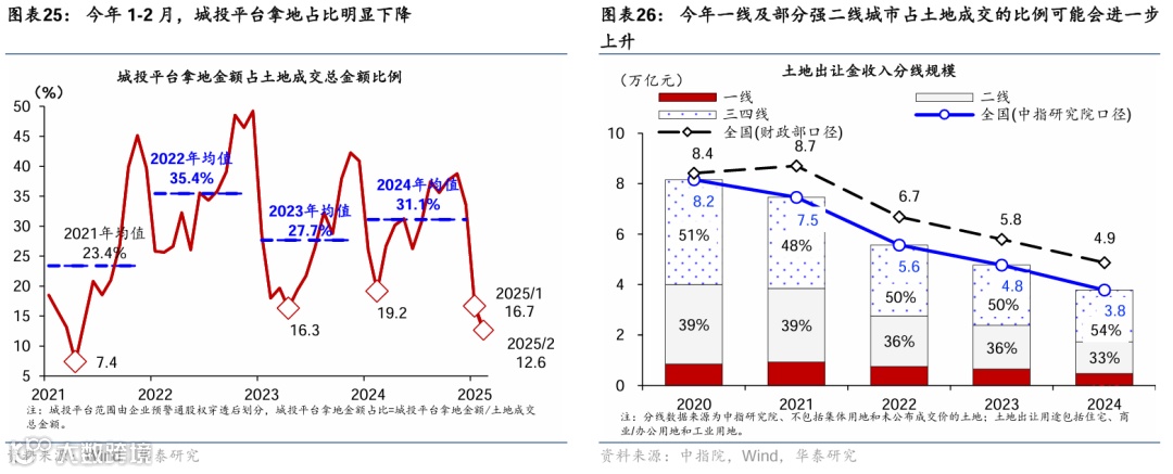 结构上看,城投拿地占比下降、一线及高能级二线城市及民营开发商占比上升、以及土地溢价率回升,都显示土地市场底部正在渐渐形成过程中。企业预警通数据显示,今年1-2月,城投平台拿地占比已从前几年的30%左右降至20%以下,或有助于形成真正意义上地方政府现金流的转化率上升(图表25)。今年以来,土地成交市场高度集中在少数一二线城市,如北京、上海、杭州、成都等城市,而三四线城市土地成交金额同比回落,预计一线及强二线城市占土地成交的比例将上升,显示开发商拿地信心在上升(图表26)。虽然央国企依然是拿地主角,但随着土地储备消耗到了临界点,有效库存下降,以及信心上升,此前杠杆较低的区域性民企重新开始拿地。此外,今年以来土地成交的溢价率明显上升,如克而瑞重点监测城市的平均溢价率从去年的1%-6%区间升至今年1月的8.7%、2月的13.4%,显示地方政府供地更积极,且与地产商风险偏好边际回升匹配。