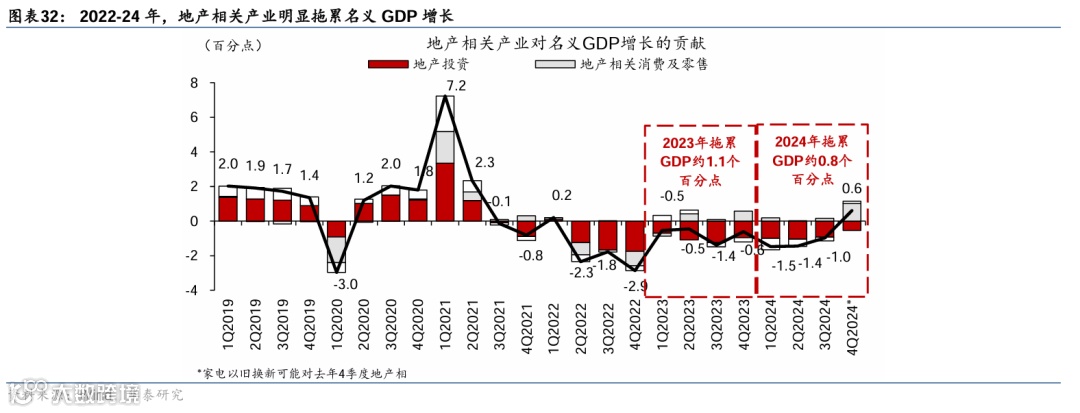 虽然近年有所回落,“泛地产”产业链仍在总需求和增长中占有较大的份额。如我们在《2025:中国增长能否回升》(2025/2/26)中分析,地产周期偏弱将从房地产开发投资、地产后周期消费(如家具、家电、家装等)、以及房地产服务业三个方面拖累名义GDP增速。即便经过过去几年的调整,目前上述“泛地产”产业链占名义GDP的比例可能仍超过15%。2022-24年,“泛地产”产业链对名义GDP的拖累分别约为1.6、1.1、0.8个百分点,其中2024年拖累明显收窄主要是受消费品以旧换新对家具、家电等地产相关消费的提振,并非全部来自地产周期本身的贡献(图表32)。如果地产周期能够企稳,“泛地产”产业链对名义GDP的拖累有望明显收窄。