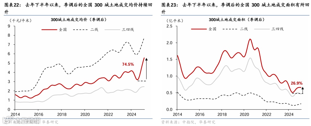 总量上看,去年下半年以来,全国土地成交呈现量价齐升的走势。图表22和23显示,去年下半年以来,季调后的300城土地成交的量和价都有明显回升;今年前两个月,300城土地成交金额累计同比回升29%。同时,统计局公布的数据显示,今年前两个月,全国土地购置费累计同比小幅下降0.3%,较去年全年8.7%的降幅明显收窄(图表24)。