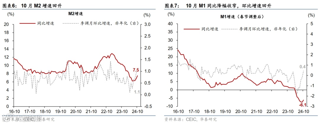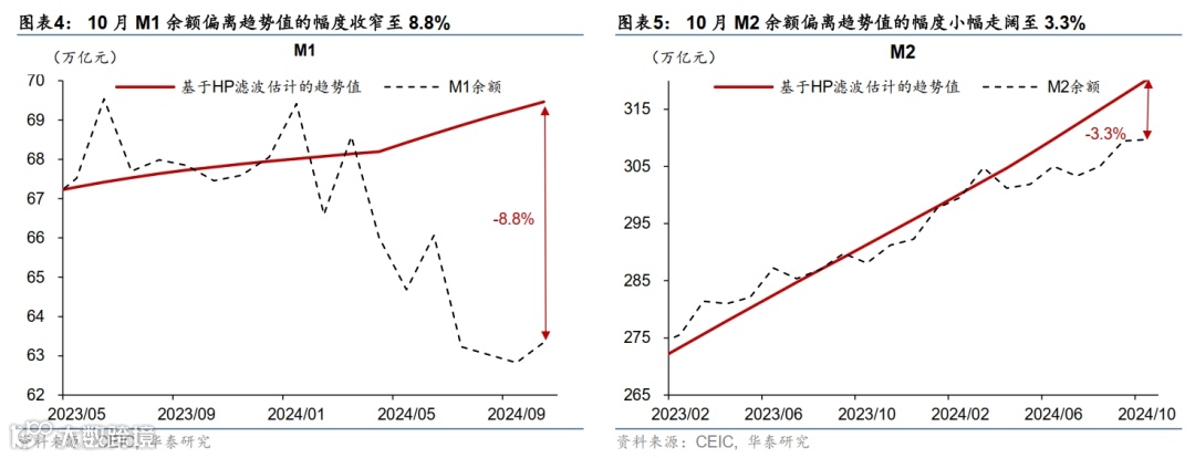 1)M1同比降幅有所收窄,显示金融“挤水分”的影响有所消退,企业现金流状况不再恶化。10月M1同比降幅从9月的7.4%收窄至6.1%(彭博一致预期-7.2%),而月环比(非年化)同比增速从9月的-0.2%转正至0.4%,同时余额偏离趋势8.8%、较9月的9.3%有所收窄,显示金融“挤水分”的影响有所下降、地产需求边际改善以及财政发力对M1形成边际提振,后续可持续性仍待观察(图表4)。