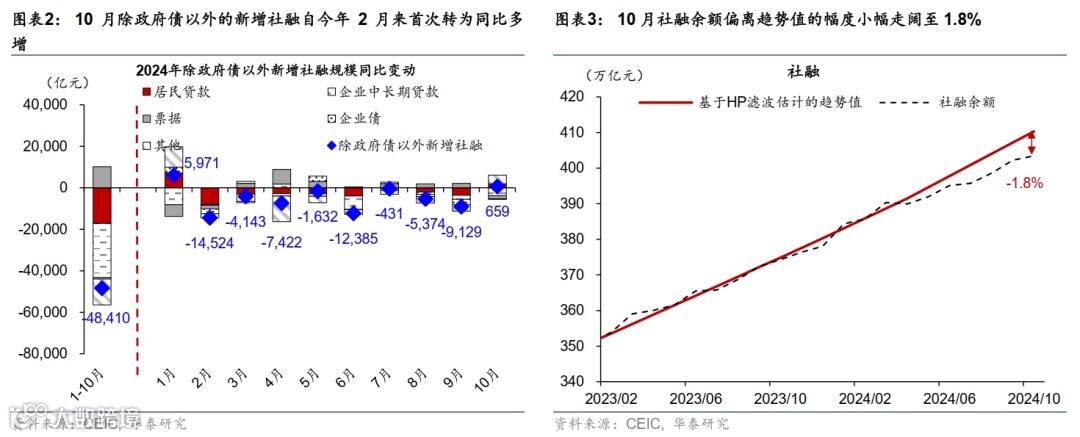3)10月新增社融为1.4万亿元(彭博一致预期1.52万亿元),同比少增4,483亿元。从贷款以外的分项看,10月政府债净发行1.05万亿元,同比少增5,142亿元,主要由于去年同期基数较高,后续需关注化债方案落地后政府债净发行能否再度回升。另一方面,9月企业债融资余额环比增加1,015亿元,同比少增163亿元,可能仍受信用债市场调整的影响。此外,10月包括信托贷款、委托贷款与银行未贴现承兑汇票在内的“非标”资产合计余额环比减少1,443亿元,同比少减1,129亿元,主要受表外票据同比少减1,138亿元提振,可能亦反映银行票据冲量规模下降。