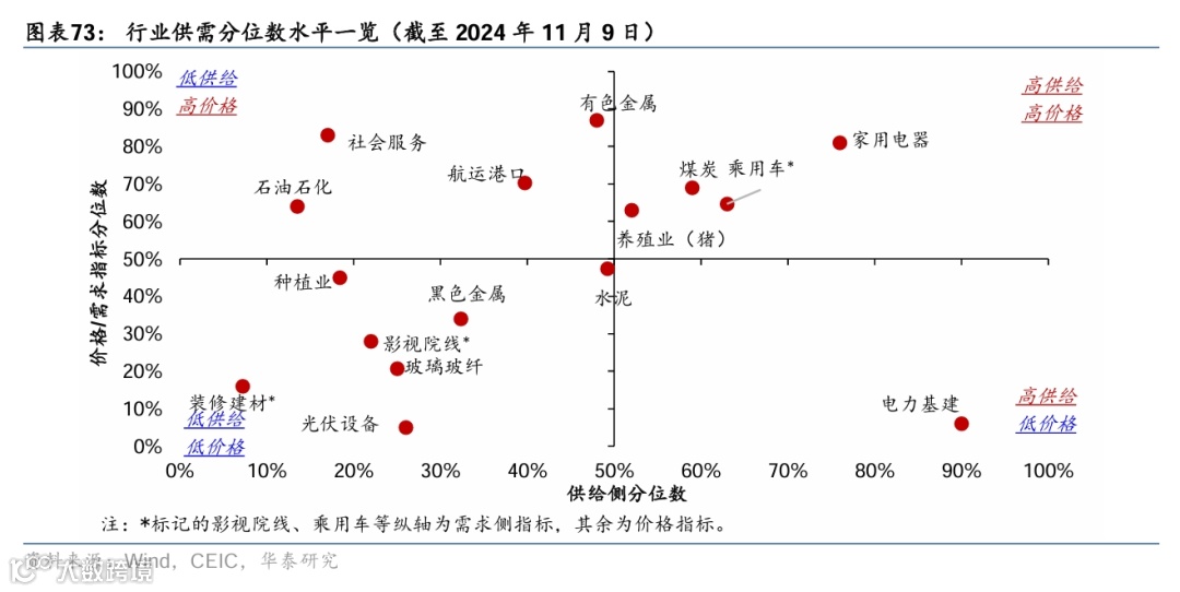 黑色金属、种植业、光伏设备、水泥和装修建材等行业所在分位数水平处于低供给、低需求区间,体现上述行业供需两侧均有所承压。通信产品、锂电池和光伏设备的价格水平仍在低位。