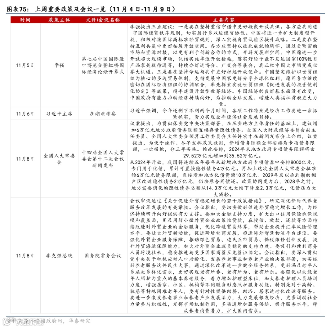 事件:1)11月8日,人大常委会新闻发布会宣布增加6万亿元地方政府债务限额置换存量隐性债务;2)11月8日,李强总理主持召开国务院常务会议,审议通过《关于促进外贸稳定增长的若干政策措施》。