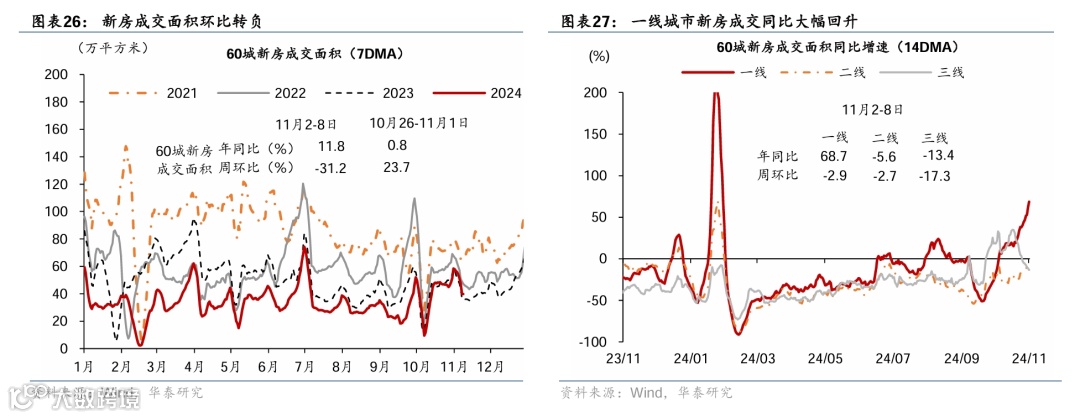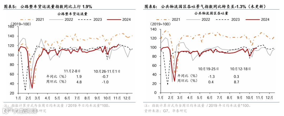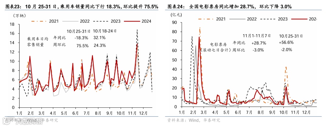 线下消费:汽车零售环比上行,电影票房环比小幅下降但显著高于去年同期。10月25-31日乘用车日均零售销量同比低于历史同期18.3%,但环比增速提升至75.5%。10月全月乘用车零售量同比增长11.3%,环比增长7.2%。“金九银十”、以旧换新政策落地,及各地促消费政策落地带动购车需求增加。此外,11月1-7日,全国电影票房环比下降3%,且相比去年同期提高28.7%。