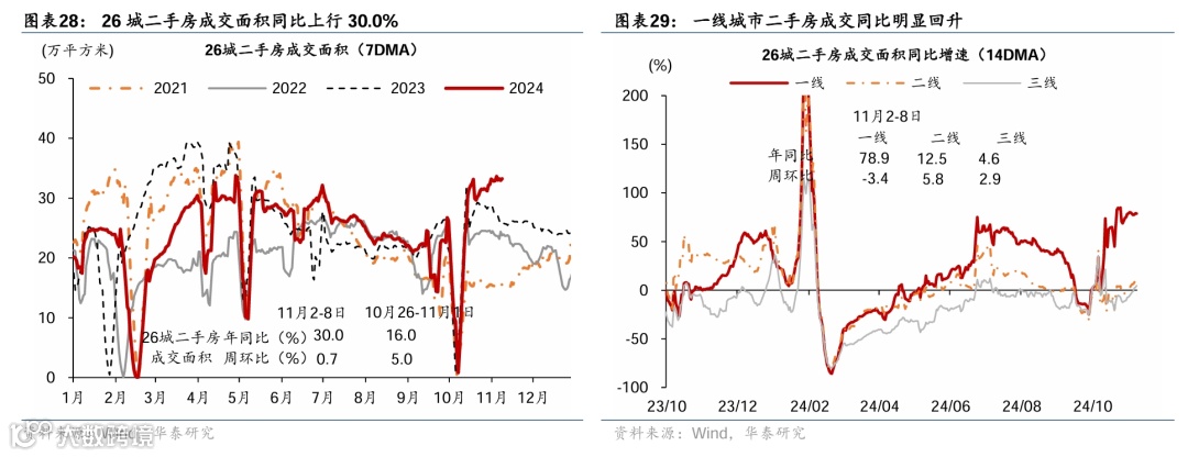 26城二手房成交面积同比增速由前一周的16.0%上行至30.0%,环比上行0.7%。分线而言,一/二/三线城市二手房成交面积同比分别上行78.9%/12.5%/4.6%。具体看,一线城市中,北京/深圳二手房成交面积同比大幅上行50.4%/167.0%,二线城市中,成都/青岛/苏州/厦门/南宁同比分别上行52.4%/120.9%/12.5%/47.0%/74.7%,杭州同比下行13.2%。