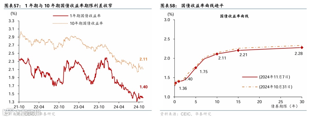流动性指标:银行间流动性偏紧,同业存单发行利率环比下行。银行间利率方面,DR007环比上行6.0个基点, R007环比上行4.4个基点。1年期国债收益率环比上行0.1个基点,10年期国债收益率环比下行3个基点,1年期和10年期国债收益率期限利差小幅收窄,国债收益率曲线小幅趋平。上周央行质押式回购加权利率上升4.9个基点;同业存单净发行量环比上行,发行利率环比下行。